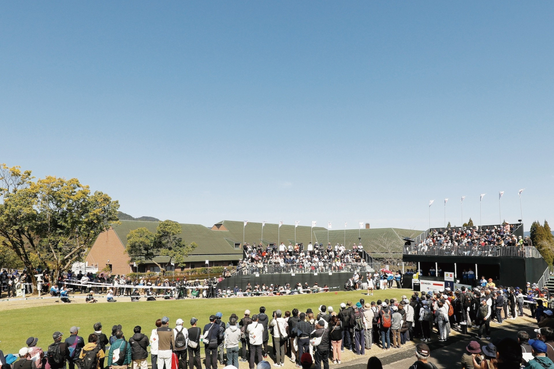 鹿児島高牧カントリークラブは2010年「Tポイントレディスゴルフトーナメント」の開催以降、JLPGAツアーの開催コースとして全国のゴルフファンにもその名を知られています。 2024年には「Vポイント×ENEOS ゴルフトーナメント」が開催され、9回に渡り、トッププロをはじめとした選手による熱戦が繰り広げられました。 一流選手のプレーをひと目見ようと、県内外から多くのゴルフファンが駆け付け、賑わいをみせました。